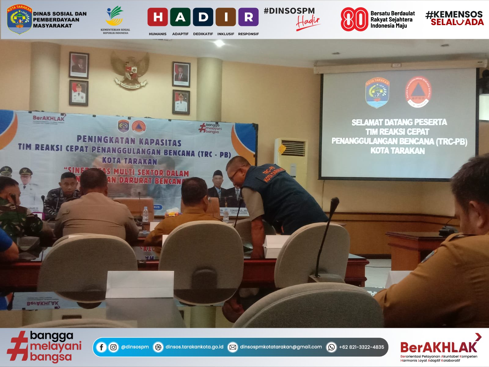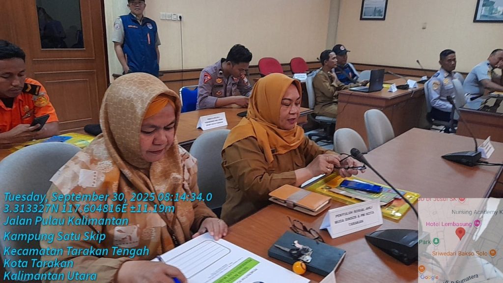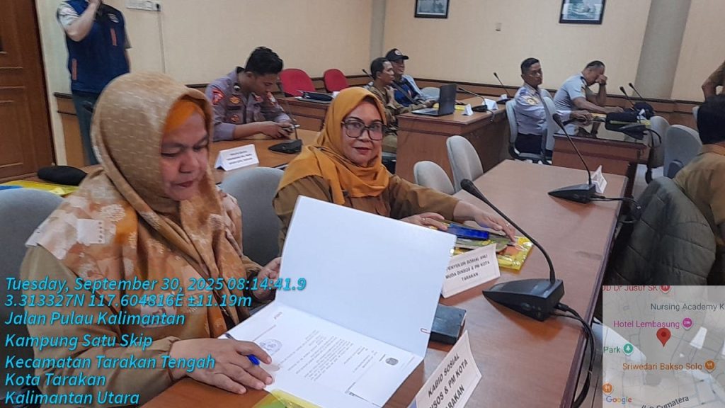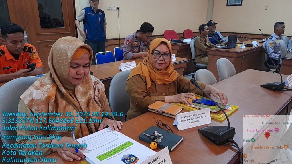 Tarakan. Penyuluh Sosial Ahli Muda Dinas Sosial dan Pemberdayaan Masyarakat Kota Tarakan, Ir. Rosmala, Didampingi Pengolah Data dan Informasi Bidang Sosial, Hadania, S.Kom, Menghadiri Kegiatan Peningkatan Kapasitas Tim Reaksi Cepat Penanggulangan Bencana (TRC-PB) Kota Tarakan Tahun 2025, Pada Selasa (30/09/2025) Di Ruang Imbaya Kantor Wali Kota Tarakan.