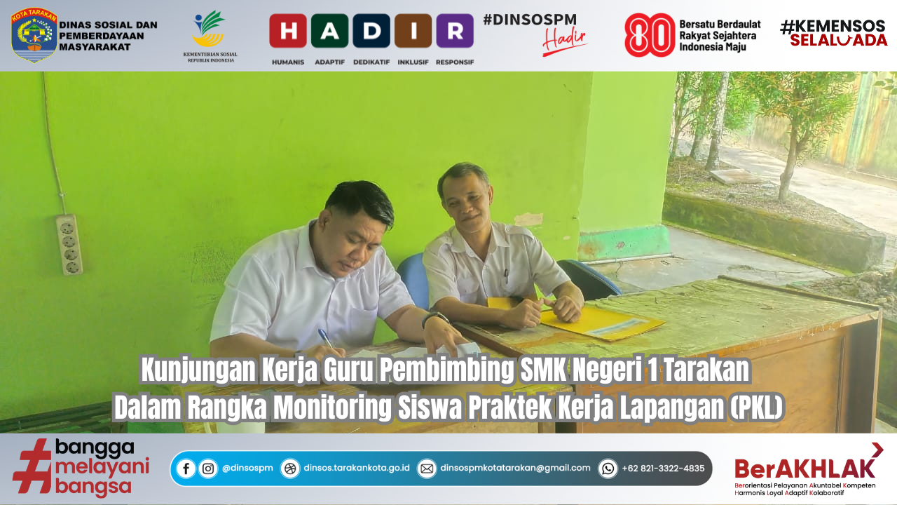 Tarakan. Kepala Sub Bagian Umum dan Kepegawaian Dinas Sosial dan Pemberdayaan Masyarakat Kota Tarakan, Afriyona Maidda, S.E., M.H, Menerima Kunjungan Kerja (Kunker) Guru Pembimbing SMK Negeri 1 Tarakan, Supardi, S.Pd, Dalam Rangka Melaksanakan Monitoring Ke-2 Siswa Praktek Kerja Lapangan (PKL), Pada Rabu (01/10/2025) Di Dinas Sosial dan Pemberdayaan Masyarakat Kota Tarakan.