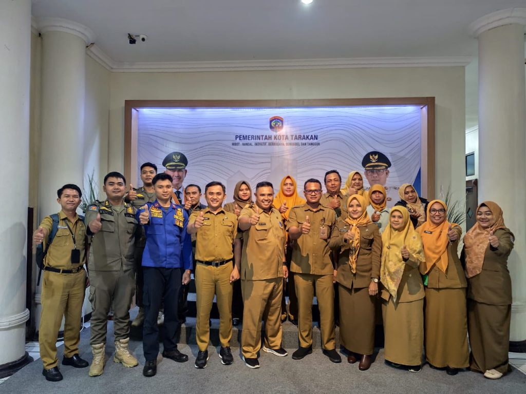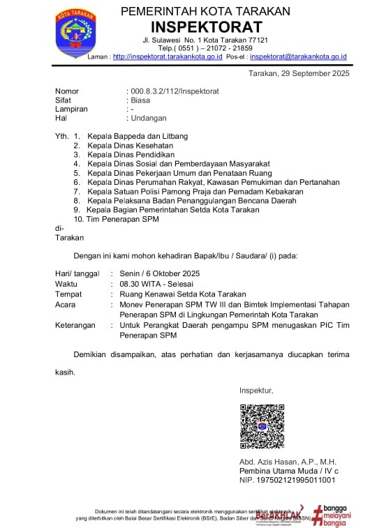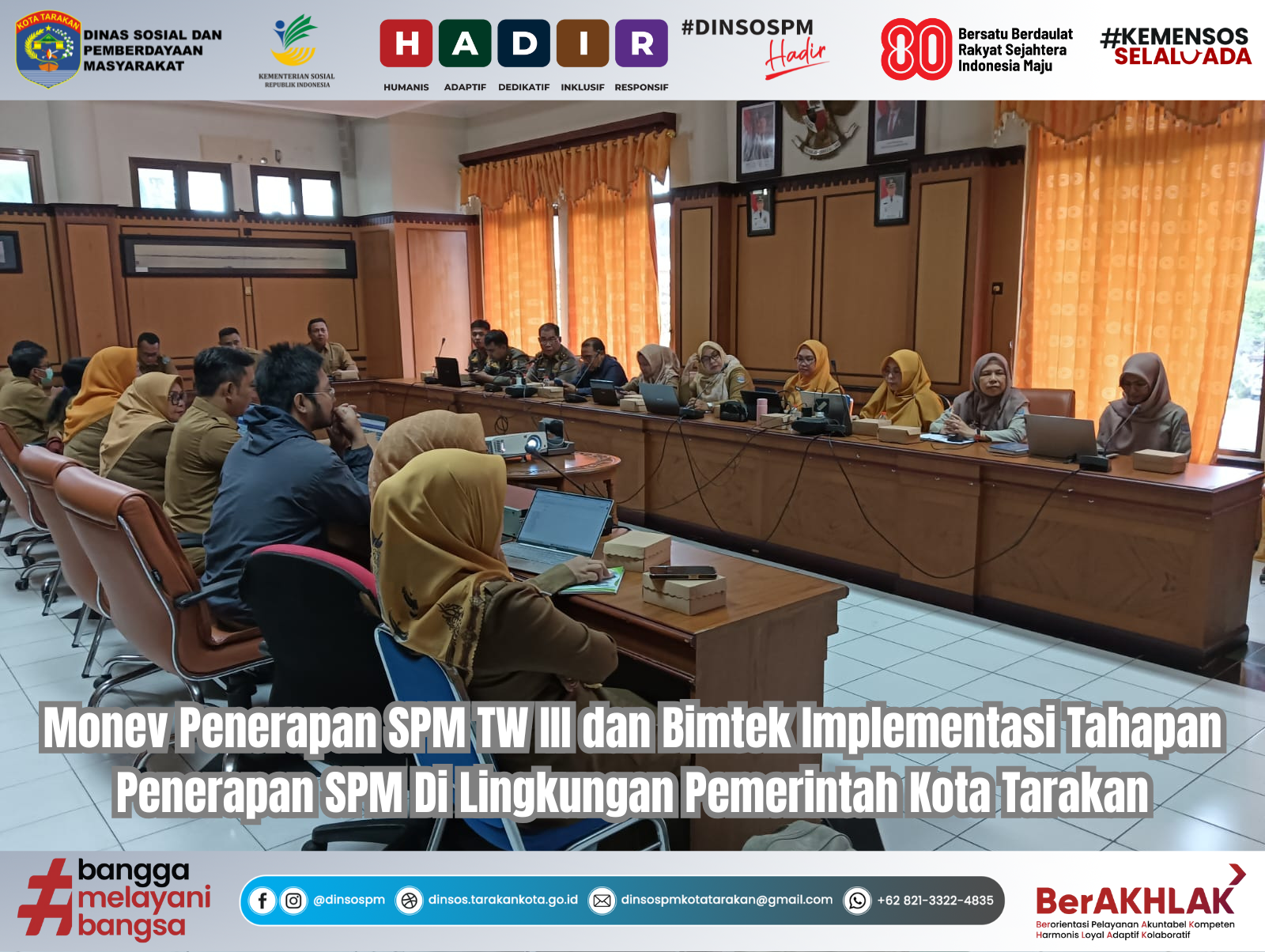 Tarakan. Penyuluh Sosial Ahli Muda Dinas Sosial dan Pemberdayaan Masyarakat Kota Tarakan, Ir. Rosmala, Didampingi PIC Tim Penerapan SPM, Rina Kanti Lestari, S.T., M.H dan Operator Layanan Operasional Rehabilitasi Sosial, Catur Dessi Trisnawati, Menghadiri Monitoring dan Evaluasi (Monev) Penerapan Standar Pelayanan Minimal (SPM) Triwulan III dan Bimbingan Teknis (Bimtek) Implementasi Tahapan Penerapan Standar Pelayanan Minimal (SPM) Di Lingkungan Pemerintah Kota Tarakan, Pada Senin (06/10/2025) Di Ruang Kenawai Kantor Wali Kota Tarakan.