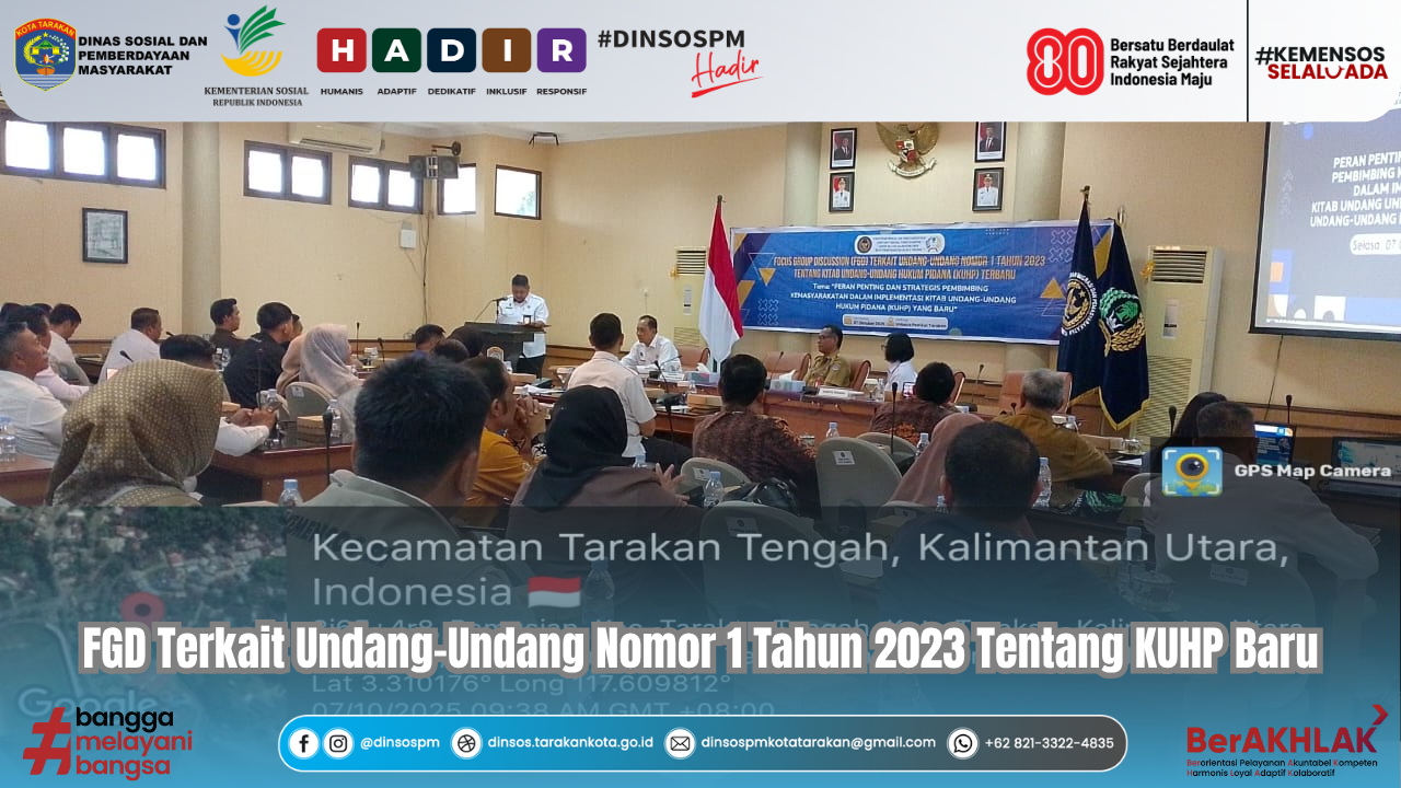 Tarakan. Plt. Sekretaris Dinas Sosial dan Pemberdayaan Masyarakat Kota Tarakan, Yang Juga Menjabat Sebagai Kepala Bidang Sosial, Drs. Jamaluddin Malla, Didampingi Pekerja Sosial Ahli Pertama, Zulfa Ilmiah Sunni, S.S.T dan Penata Layanan Operasional Kemensos RI, Kuswadi Jakaria, S.I.Kom, Menghadiri Focus Group Disscussion (FGD) Terkait Undang-Undang Nomor 1 Tahun 2023 Tentang Kitab Undang-Undang Hukum Pidana (KUHP) Terbaru, Pada Selasa (07/10/2025) Di Ruang Imbaya Kantor Wali Kota Tarakan.