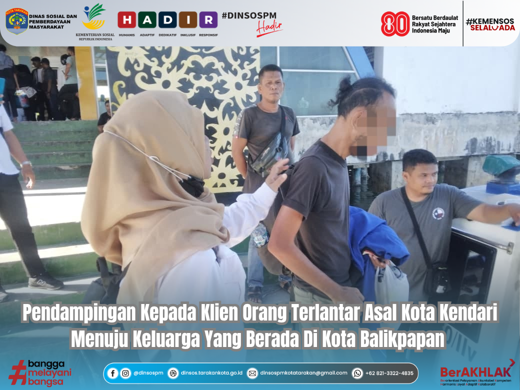 Tarakan. Pendamping Rehabilitasi Sosial (Rehsos) Dinas Sosial dan Pemberdayaan Masyarakat Kota Tarakan, Darmawan, S.E, Rini Kustiwi, Agus Wahyudi dan Mahasiswa KKP Universitas Borneo Tarakan, Melaksanakan Pendampingan Kepada Klien Orang Terlantar Asal Kota Kendari Provinsi Sulawesi Tenggara Menuju Keluarga Yang Berada Di Kota Balikpapan Provinsi Kalimantan Timur, Pada Rabu (15/10/2025) Di Pelabuhan Tengkayu 1 Kota Tarakan.