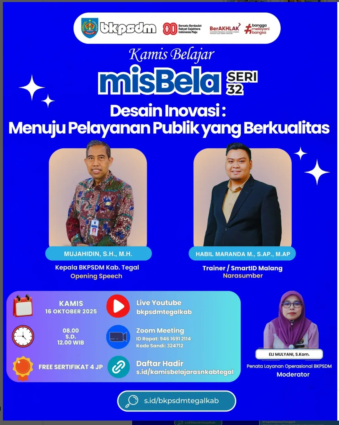 Webinar Kamis Belajar Dilaksanakan Oleh Badan Kepegawaian dan Pengembangan Sumber Daya Manusia (BKPSDM) Kabupaten Tegal. Narasumber : Habil Maranda Maghfirullah, S.A.P., M.A.P (Trainer / SmartID Malang).