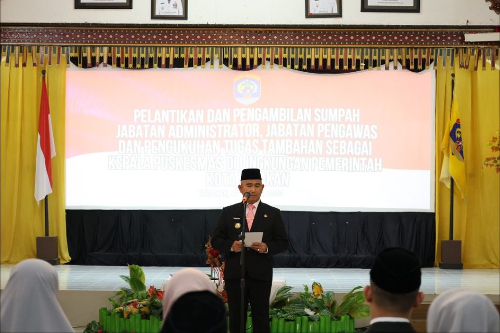 Wali Kota Tarakan, dr. Khairul, M.Kes., secara resmi melantik dan mengambil sumpah jabatan sebanyak 69 Pejabat di Lingkungan Pemerintah Kota Tarakan, yang terdiri dari Pejabat Administrator, Pengawas, Fungsional, serta Pengukuhan Tugas Tambahan Kepala Puskesmas.