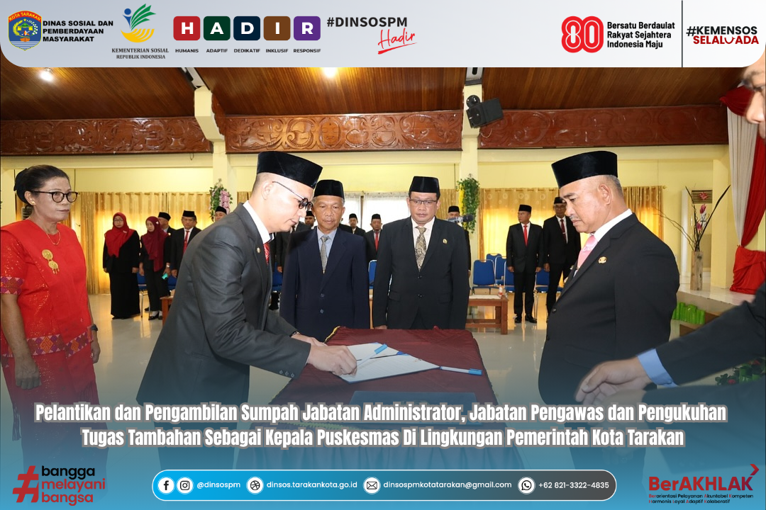 Tarakan, Kepala Dinas Sosial dan Pemberdayaan Masyarakat Kota Tarakan, Arbain, S.E., M.A.P, Menghadiri Pelantikan dan Pengambilan Sumpah Jabatan Administrator, Jabatan Pengawas dan Pengukuhan Tugas Tambahan sebagai Kepala Puskesmas Di Lingkungan Pemerintah Kota Tarakan, Pada Kamis (16/10/2025) Di Gedung Serbaguna Kantor Wali Kota Tarakan.