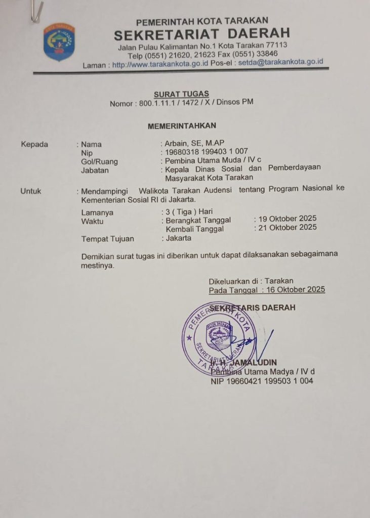 Tarakan. Kepala Dinas Sosial dan Pemberdayaan Masyarakat Kota Tarakan, Arbain, S.E., M.A.P, Mendampingi Wali Kota Tarakan, dr. H. Khairul, M.Kes, Melakukan Kunjungan Kerja Ke Beberapa Kementerian Dalam Rangka Koordinasi dan Konsultasi Terkait Program Strategis Nasional Tahun 2026 Di Kota Tarakan, Pada Senin (20/10/2025) Di Jakarta.
