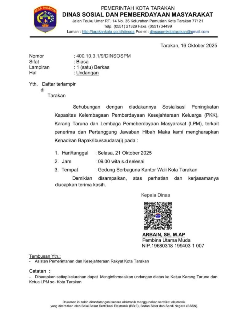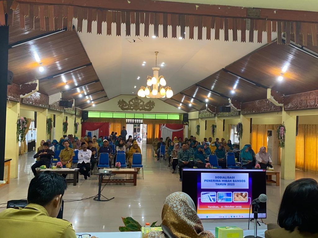 Tarakan. Dinas Sosial dan Pemberdayaan Masyarakat Kota Tarakan Melalui Bidang Pemberdayaan Masyarakat, Melaksanakan Sosialisasi Peningkatan Kapasitas Kelembagaan Pemberdayaan Kesejahteraan Keluarga (PKK), Karang Taruna dan Lembaga Pemberdayaan Masyarakat (LPM), Terkait Penerima dan Pertanggungjawaban Hibah, Pada Selasa (21/10/2025) Di Gedung Serbaguna Kantor Wali Kota Tarakan.