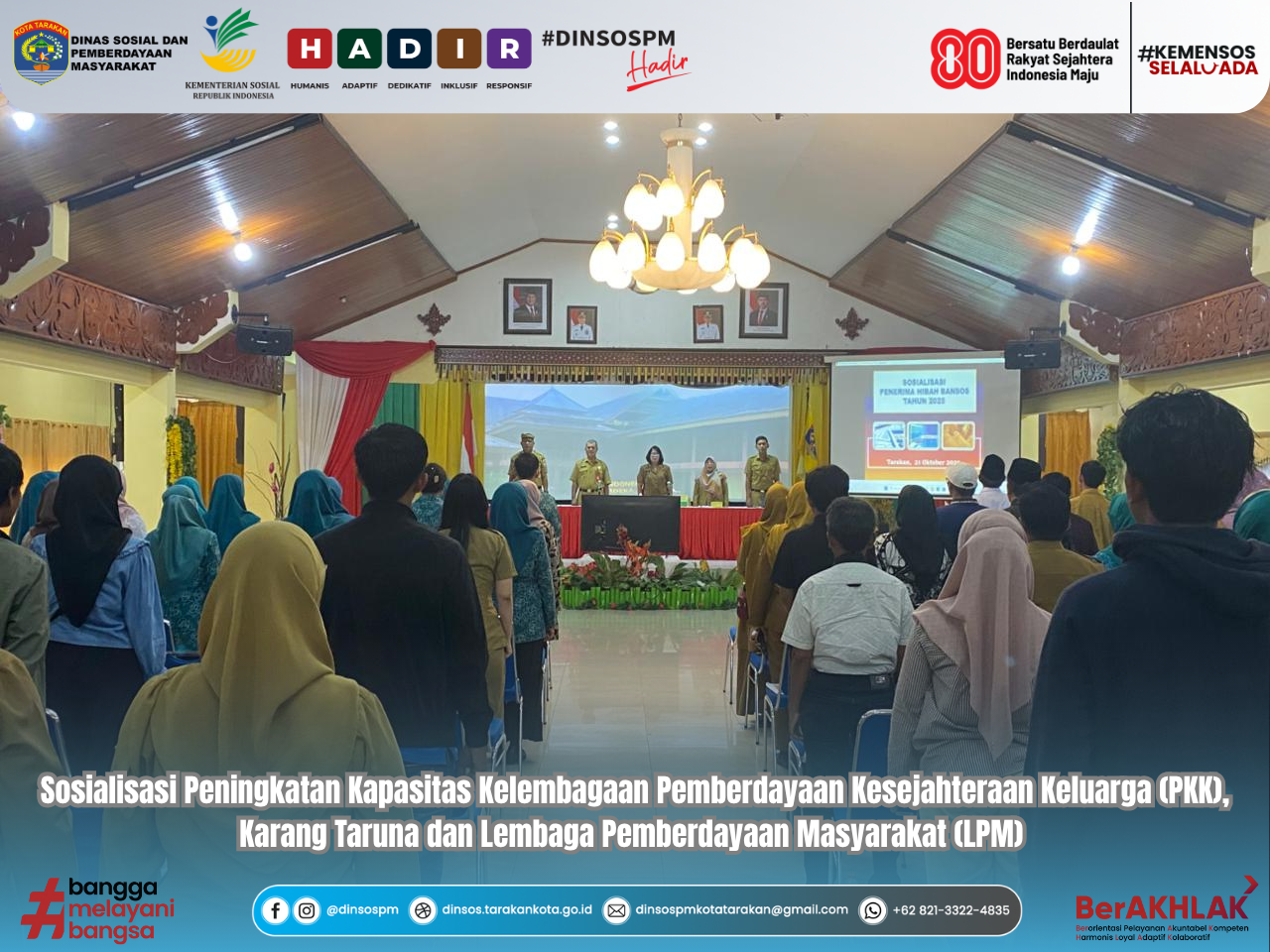 Tarakan. Dinas Sosial dan Pemberdayaan Masyarakat Kota Tarakan Melalui Bidang Pemberdayaan Masyarakat, Melaksanakan Sosialisasi Peningkatan Kapasitas Kelembagaan Pemberdayaan Kesejahteraan Keluarga (PKK), Karang Taruna dan Lembaga Pemberdayaan Masyarakat (LPM), Terkait Penerima dan Pertanggungjawaban Hibah, Pada Selasa (21/10/2025) Di Gedung Serbaguna Kantor Wali Kota Tarakan.