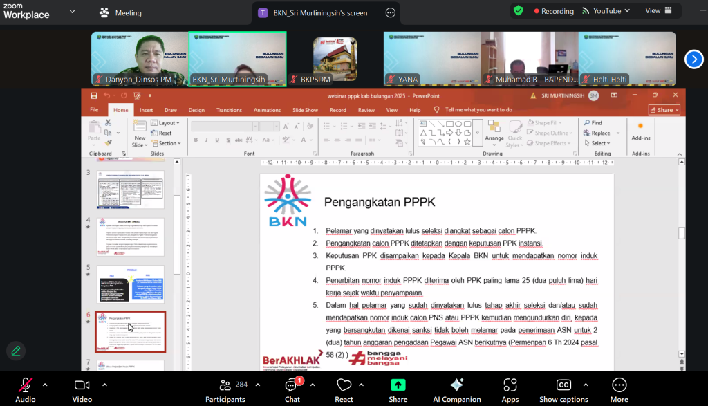 Tarakan. Kepala Sub Bagian Umum dan Kepegawaian Dinas Sosial dan Pemberdayaan Masyarakat Kota Tarakan, Afriyona Maidda, S.E., M.H, Mengikuti Kegiatan Zoom Meeting Webinar Bulungan Bebalun Ilmu Seri 20, Dengan Tema “Menjaga Eksistensi PPPK”, Pada Kamis (23/10/2025).