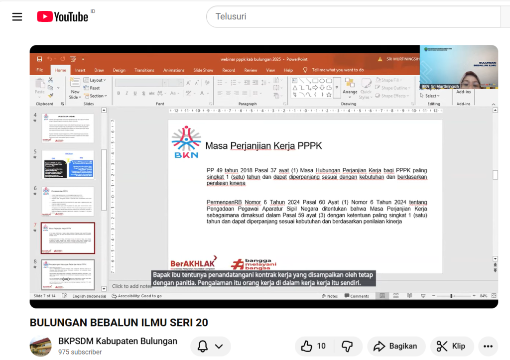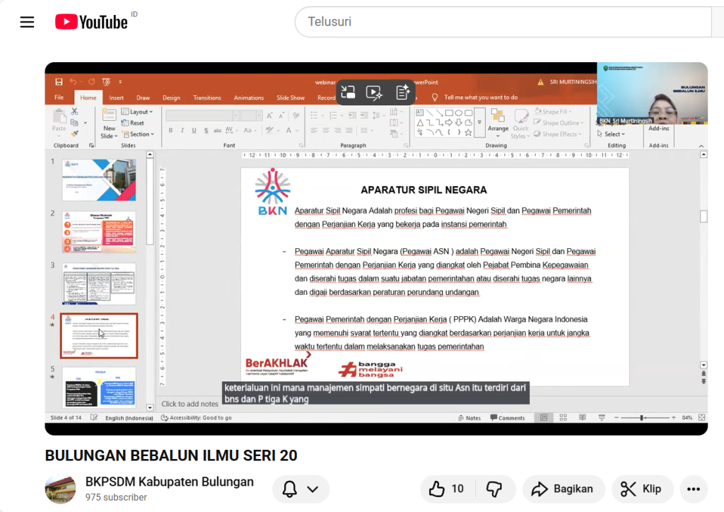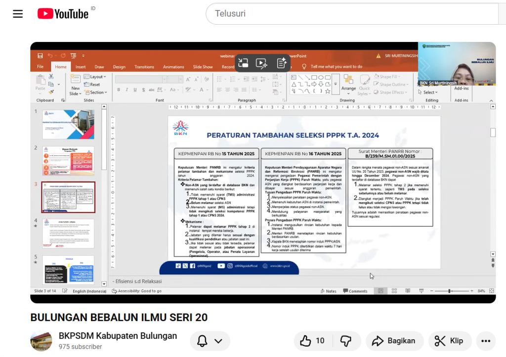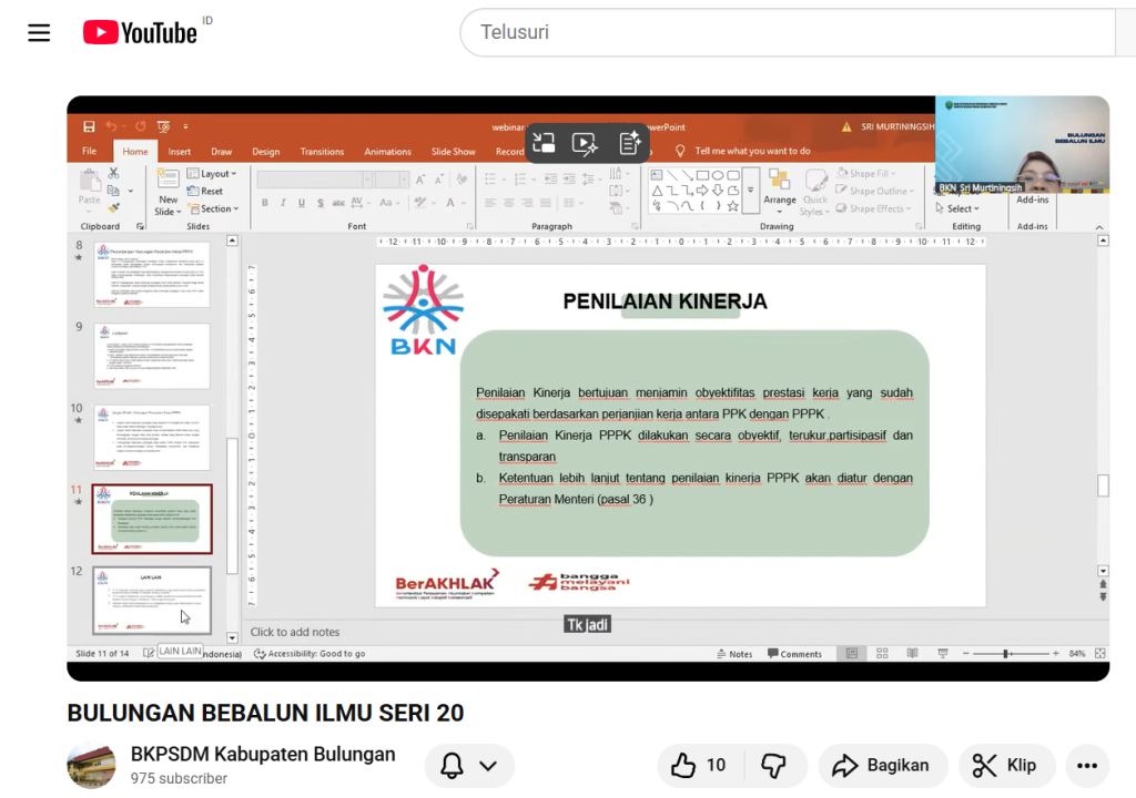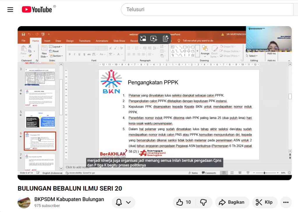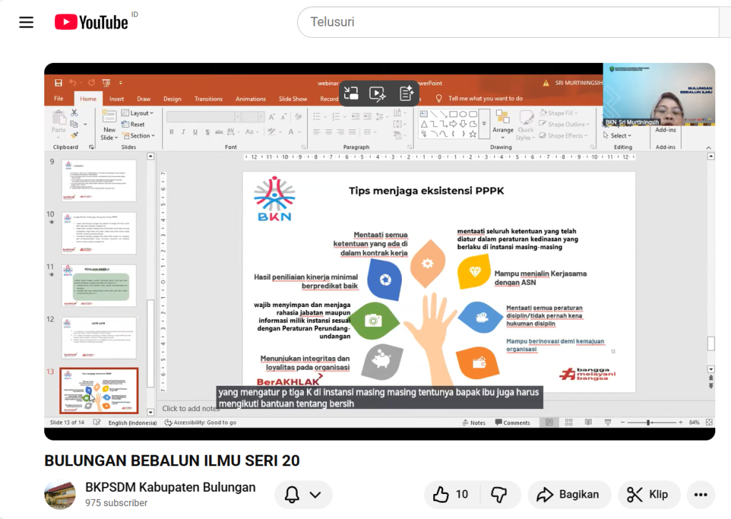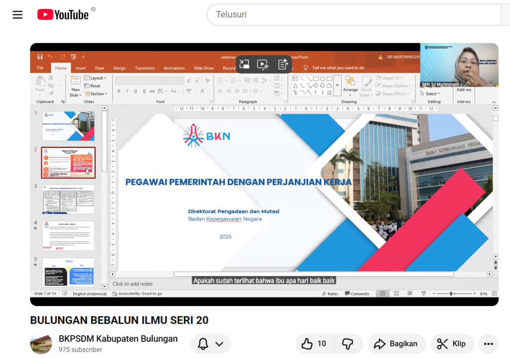 Webinar Dilaksanakan Oleh Badan Kepegawaian dan Pengembangan Sumber Daya Manusia (BKPSDM) Kabupaten Bulungan. Adapun Narasumber Dari Badan Kepegawaian Negara Republik Indonesia (BKN RI), Sri Murtiningsih, S.H., M.H. (Analis SDM Ahli Madya).