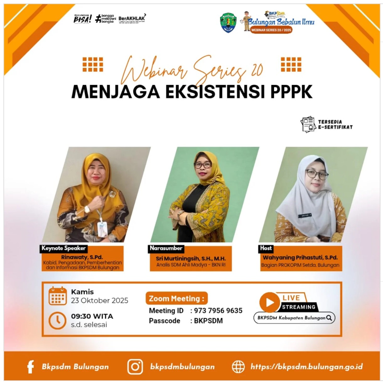 Webinar Dilaksanakan Oleh Badan Kepegawaian dan Pengembangan Sumber Daya Manusia (BKPSDM) Kabupaten Bulungan. Adapun Narasumber Dari Badan Kepegawaian Negara Republik Indonesia (BKN RI), Sri Murtiningsih, S.H., M.H. (Analis SDM Ahli Madya).