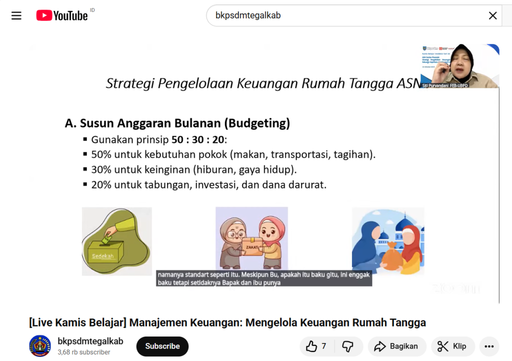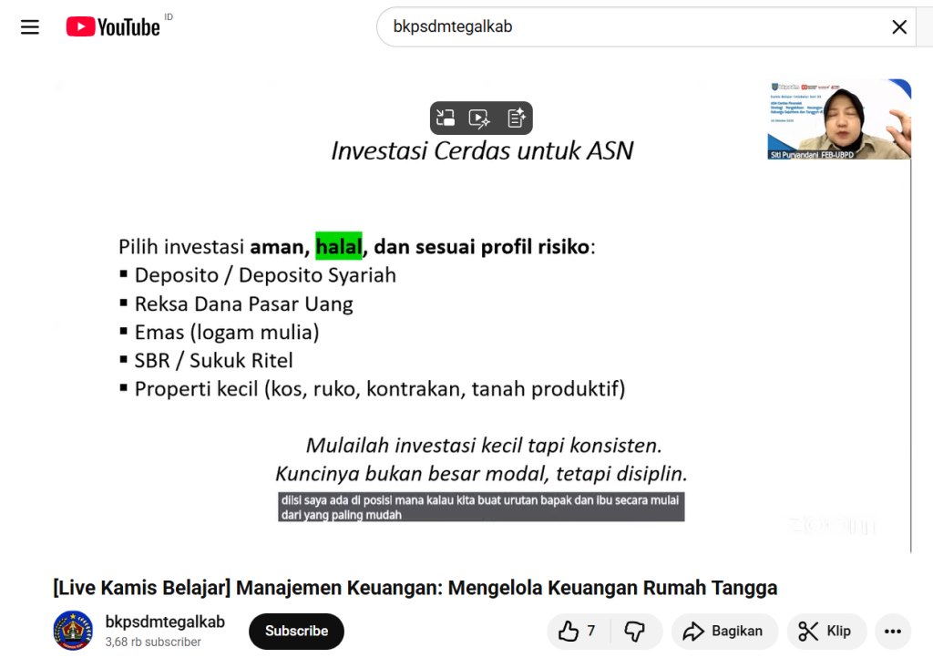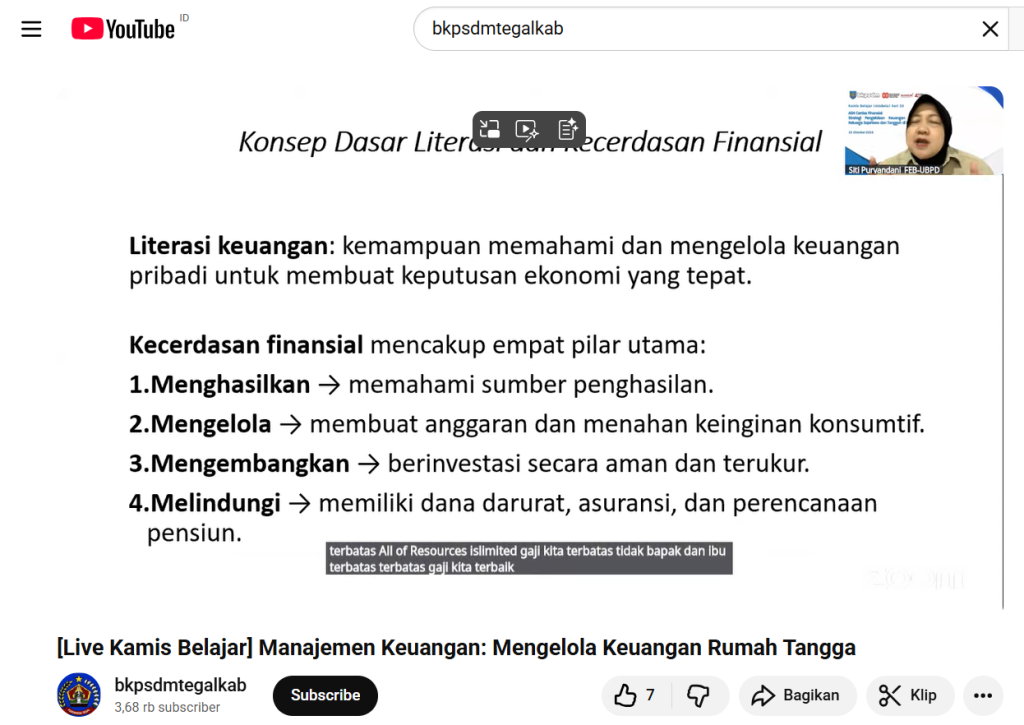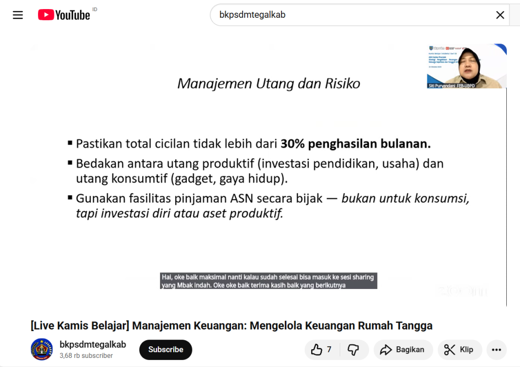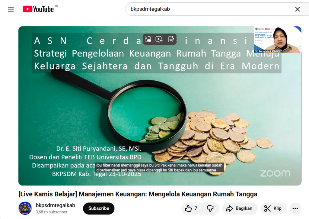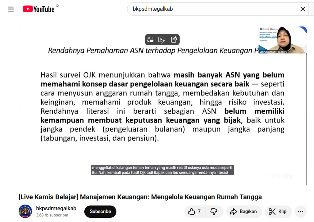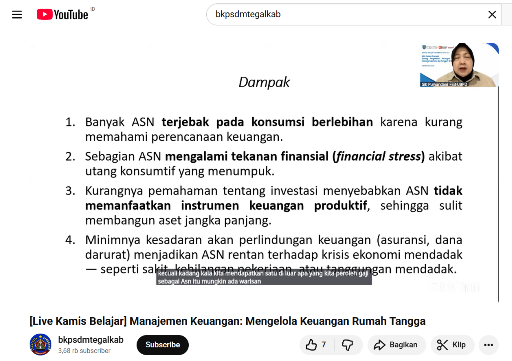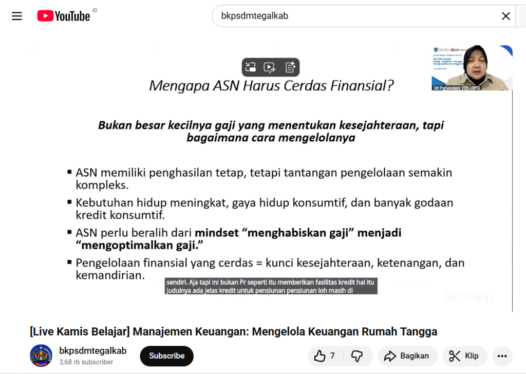 Webinar Kamis Belajar Dilaksanakan Oleh Badan Kepegawaian dan Pengembangan Sumber Daya Manusia (BKPSDM) Kabupaten Tegal. Narasumber : Dr. E. Siti Puryandani, S.E., M.Si (Dosen dan Peneliti Fakultas Ekonomi dan Bisnis Universitas Bank Pembangunan Daerah Semarang).