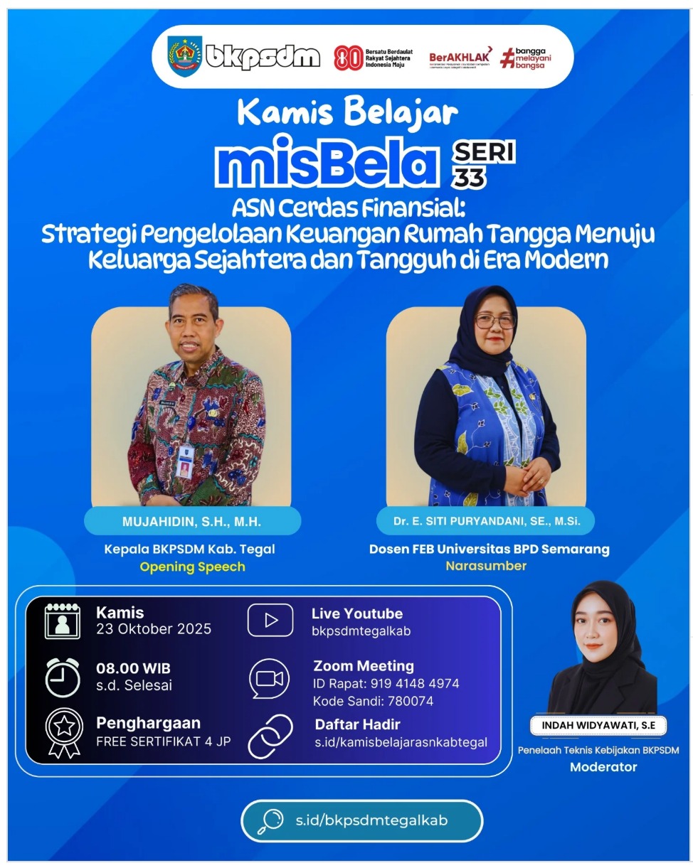 Webinar Kamis Belajar Dilaksanakan Oleh Badan Kepegawaian dan Pengembangan Sumber Daya Manusia (BKPSDM) Kabupaten Tegal. Narasumber : Dr. E. Siti Puryandani, S.E., M.Si (Dosen dan Peneliti Fakultas Ekonomi dan Bisnis Universitas Bank Pembangunan Daerah Semarang).