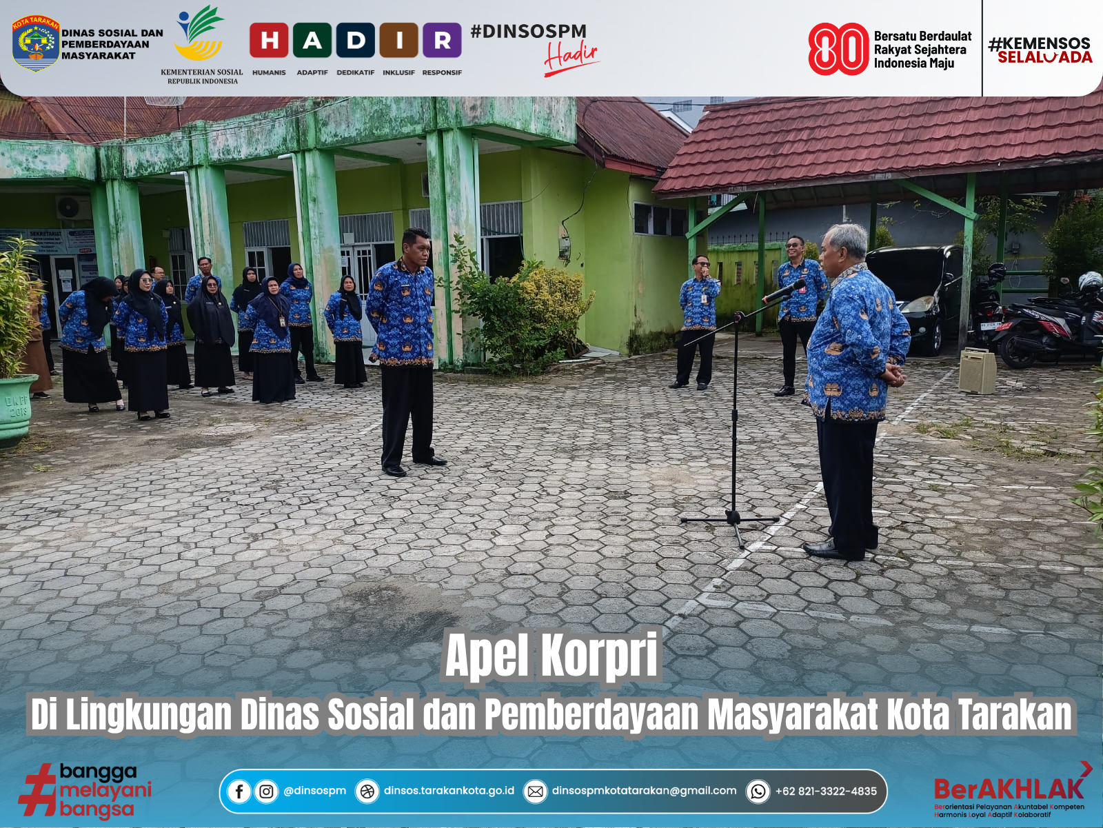 Tarakan. Pelaksanaan Apel Korpri Dinas Sosial dan Pemberdayaan Masyarakat Kota Tarakan, Yang Diikuti ASN (PNS, PPPK Kemensos RI/Daerah) dan Non ASN (Tenaga Kontrak), Serta Siswa Magang SMK Negeri 4 dan SMK Negeri 1 Tarakan, Pada Senin (17/11/2025).