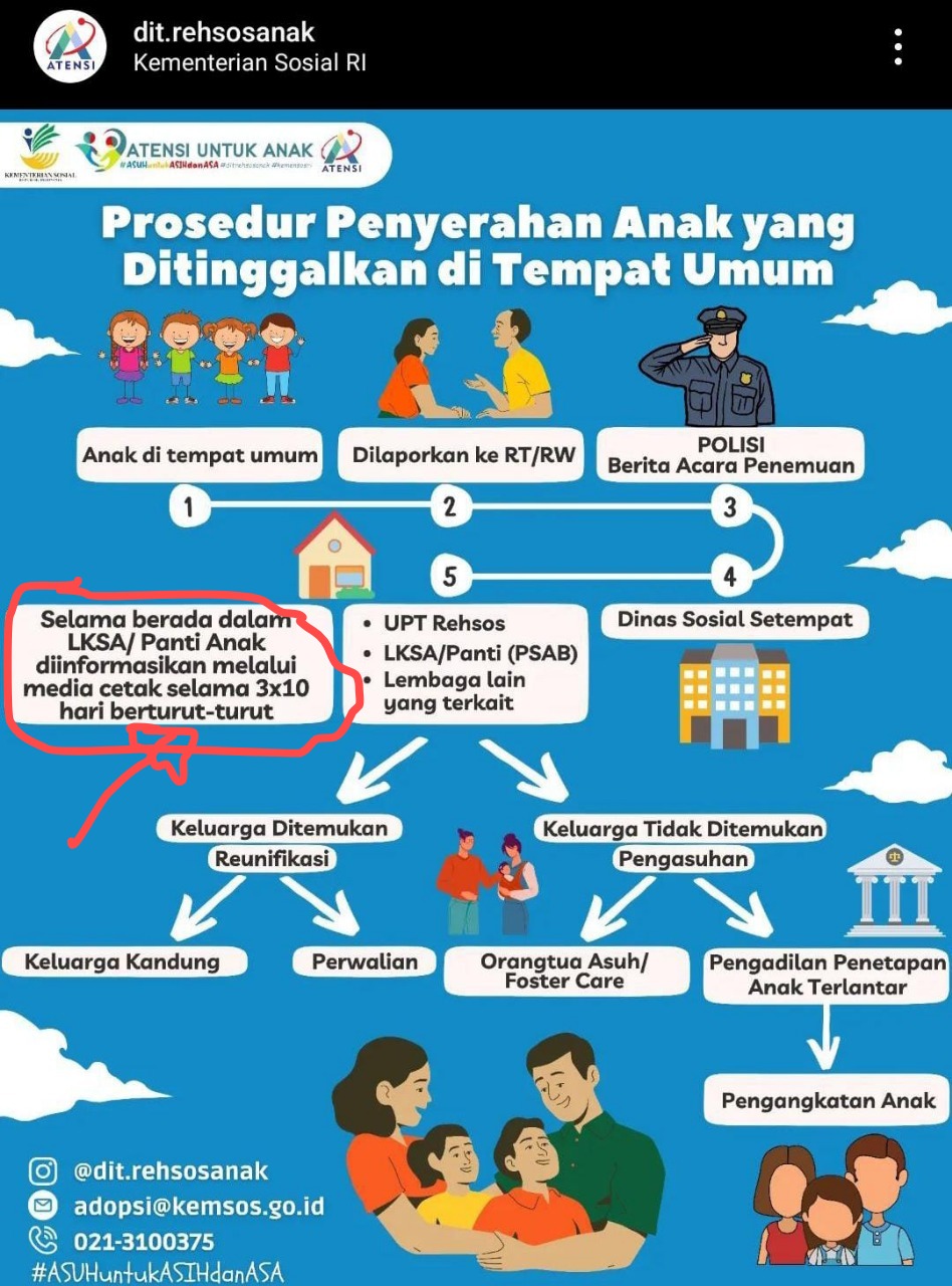 Tarakan. Sembari menunggu proses hukum berjalan, Dinas Sosial dan Pemberdayaan Masyarakat Kota Tarakan secara paralel melakukan upaya pemberitahuan kepada masyarakat terkait penemuan bayi ini. Alghi Fari Smith, S.S.T selaku Pekerja Sosial Ahli Pertama mengimbau masyarakat yang merasa mengenali bayi atau mengetahui keberadaan orang tuanya agar segera melapor.