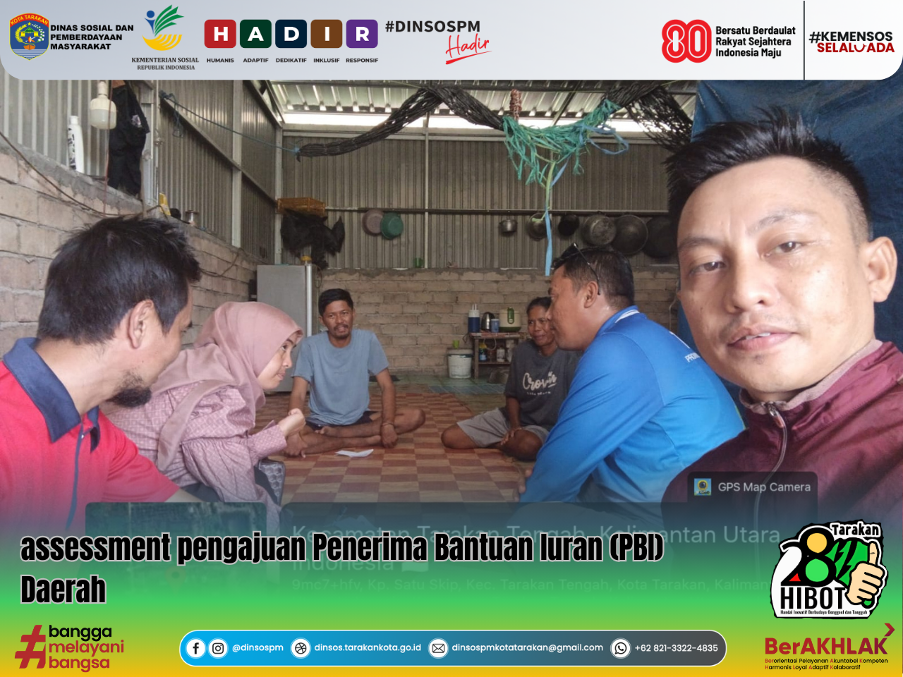 Dinsos PM Kota Tarakan melaksanakan Dinsos PM Kota Tarakan melaksanakan assessment pengajuan PBI Daerah atas nama Muhammad Taufik yang beralamat di Ello, Kelurahan Kampung 1 Skip, wilayah perbatasan dengan Binalatung Pantai Amal. Kegiatan ini merupakan bagian dari proses verifikasi calon penerima bantuan sesuai ketentuan yang berlaku.