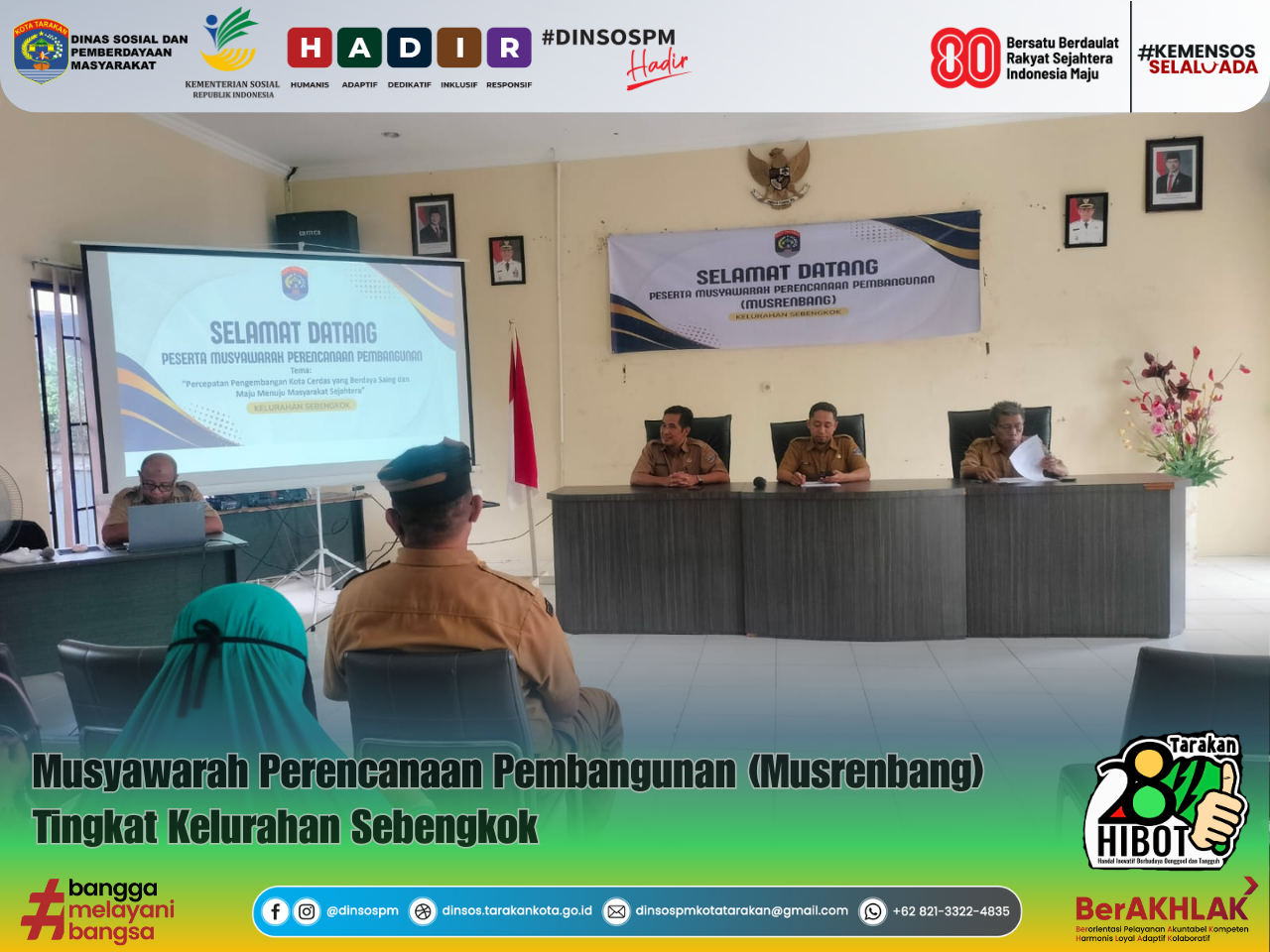 Dinas Sosial dan Pemberdayaan Masyarakat (Dinsos PM) Kota Tarakan menghadiri kegiatan Musyawarah Perencanaan Pembangunan (Musrenbang) tingkat Kelurahan Sebengkok yang dilaksanakan di ruang pertemuan Kelurahan Sebengkok. Kegiatan ini menjadi forum penting dalam menjaring aspirasi masyarakat sebagai dasar perencanaan pembangunan di tingkat kelurahan.