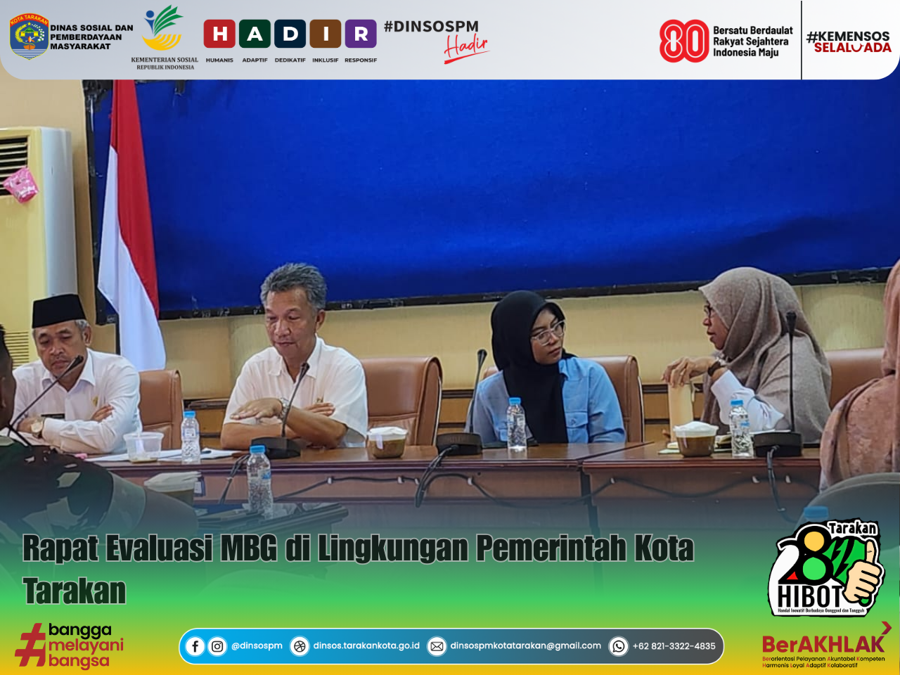 Kepala Dinas Sosial dan Pemberdayaan Masyarakat (Dinsos PM) menghadiri kegiatan Rapat Evaluasi MBG yang dilaksanakan di ruang pertemuan Imbaya, Kantor Wali Kota Tarakan, pada Rabu, 21 Januari 2026. Kegiatan ini merupakan bagian dari upaya evaluasi dan koordinasi pelaksanaan program MBG di lingkungan Pemerintah Kota Tarakan.