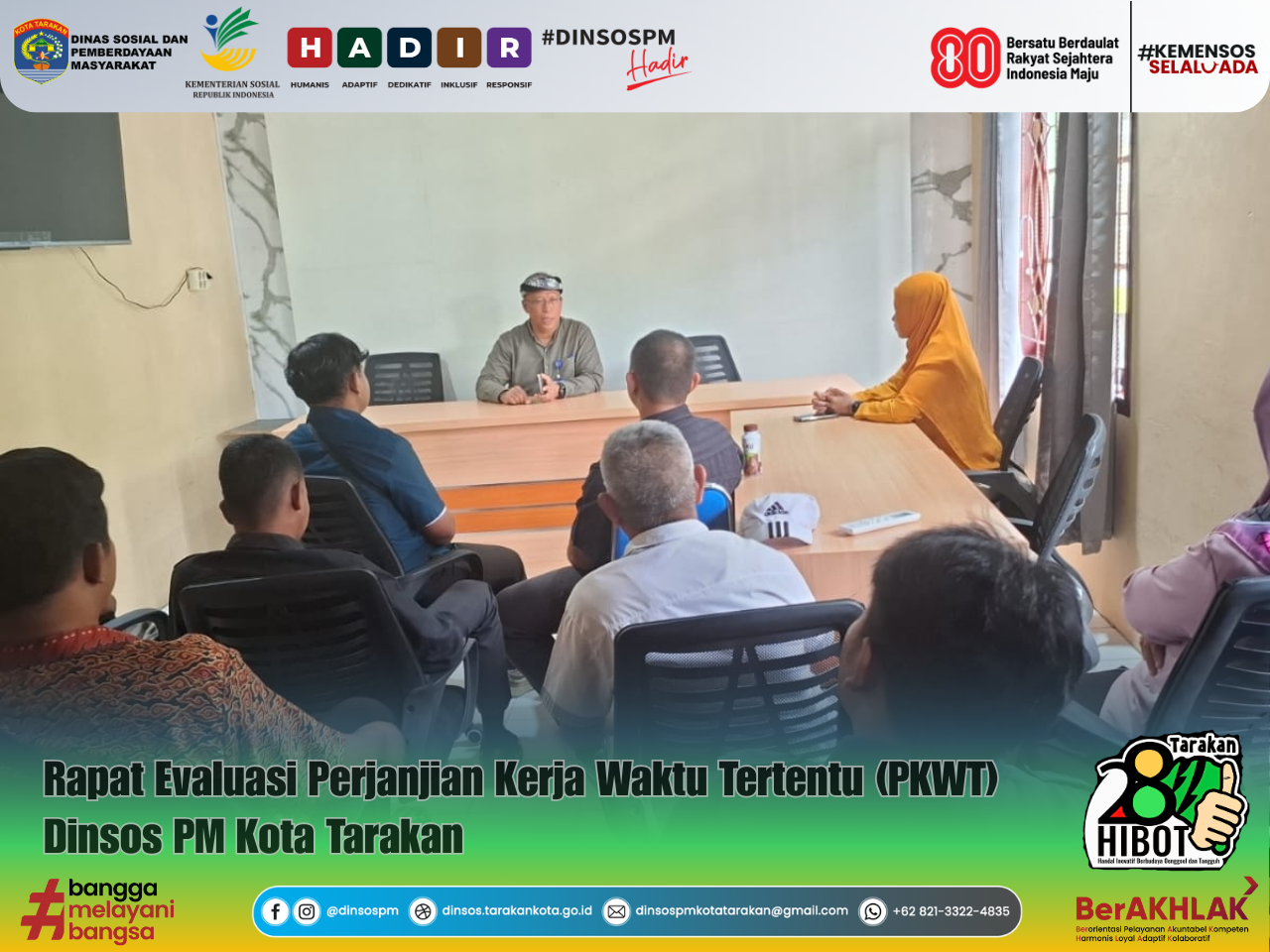 Dinas Sosial dan Pemberdayaan Masyarakat (Dinsos PM) Kota Tarakan melaksanakan Rapat Evaluasi Perjanjian Kerja Waktu Tertentu (PKWT) pada Jumat, 30 Januari 2026, bertempat di ruang rapat Dinsos PM Kota Tarakan. Kegiatan ini diikuti oleh Tenaga Non ASN sebagai bagian dari upaya peningkatan tata kelola kepegawaian di lingkungan Dinsos PM.